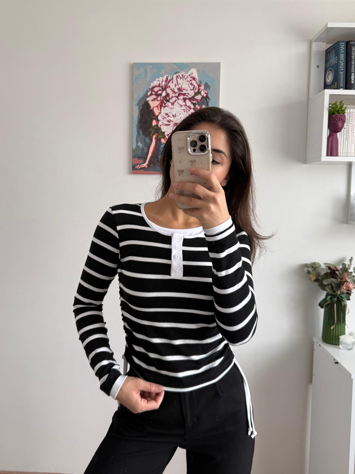 Şıklığınıza şıklık katacak olan çizgili yandan büzgülü bluz, modern tasarımı ve dikkat çekici detayları ile dolabınızdaki en özel parçalardan biri olmaya aday. Hem günlük hem de özel davetler için ideal bir seçim olan bu bluz, her anınıza zarafet katacak.