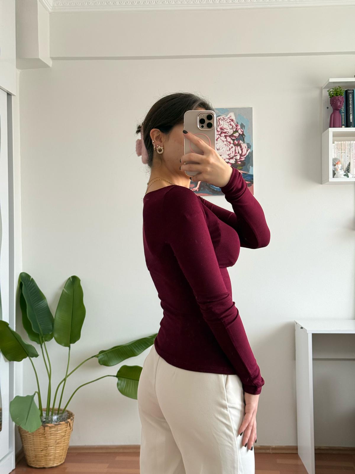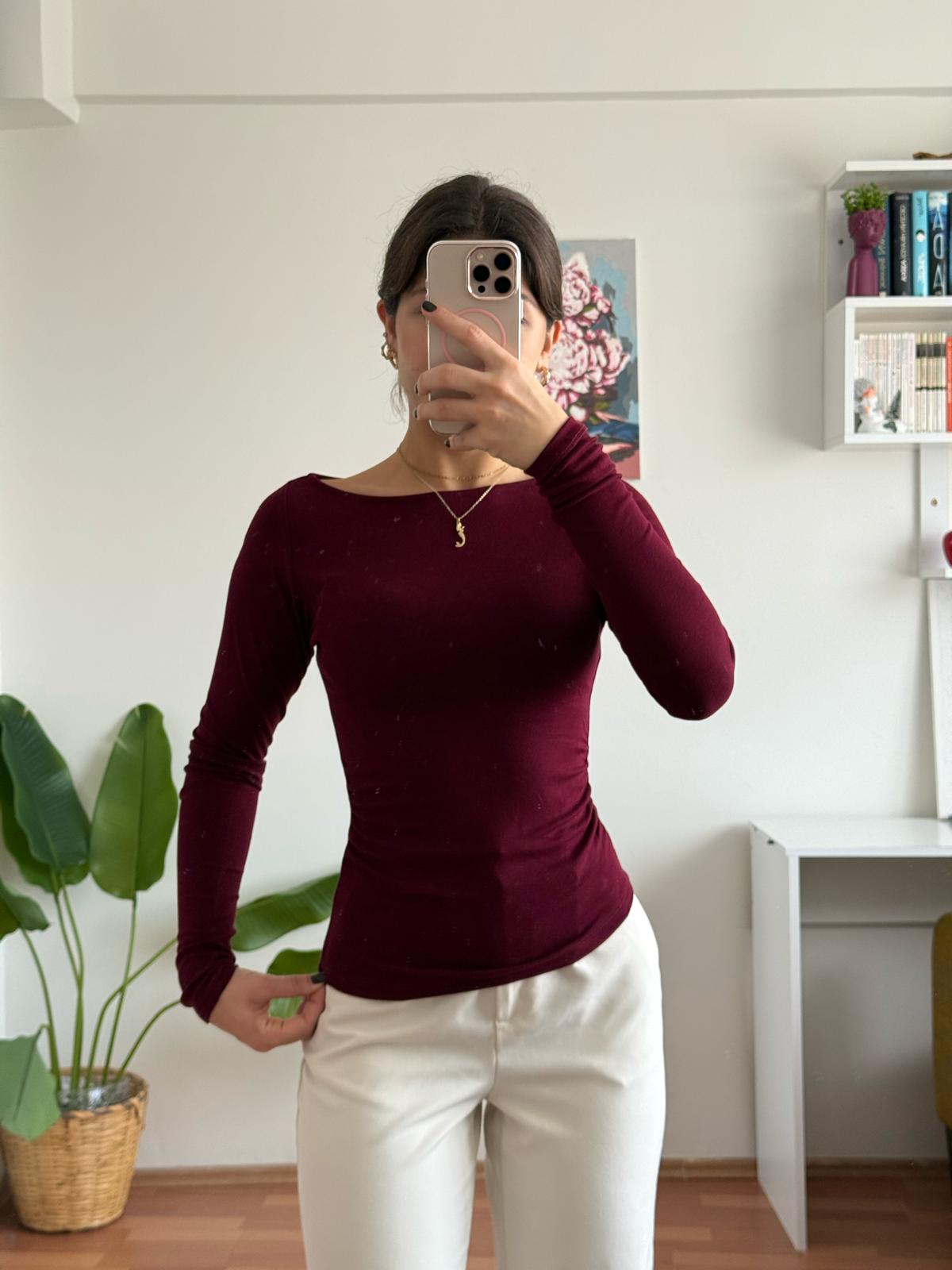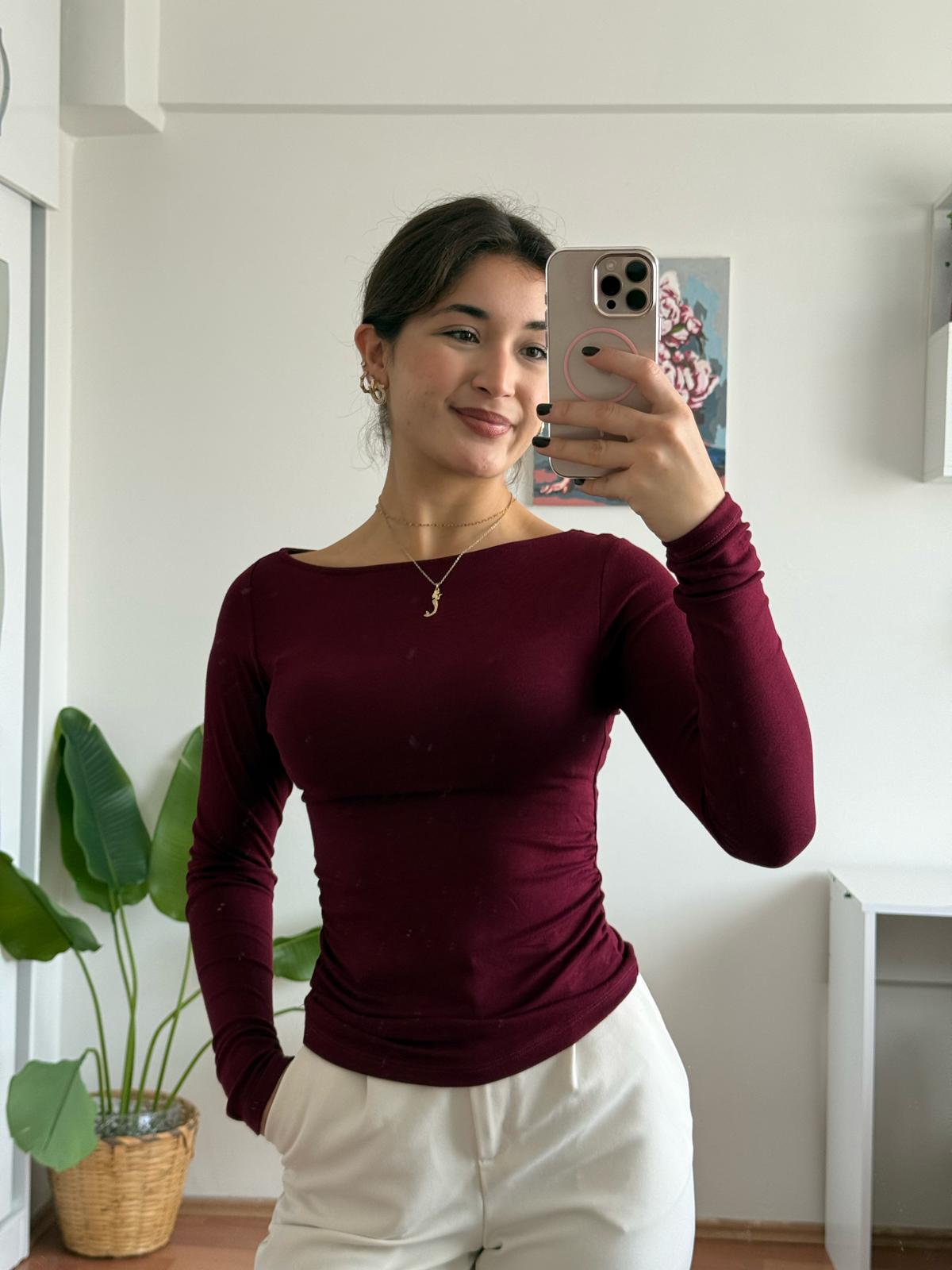 Bu bluz, kayık yaka modeli ile dekolteyi zarif bir şekilde vurgularken, yanı büzgülü detayıyla da bedeni saran şık bir siluet oluşturur. Büzgülü yan detay, belinize ince bir görünüm kazandırarak, kadınsı hatlarınızı ön plana çıkarır. Bordo rengi, özellikle sonbahar ve kış ayları için mükemmel bir tercihtir ve birçok farklı parçayla kombinlenebilir.