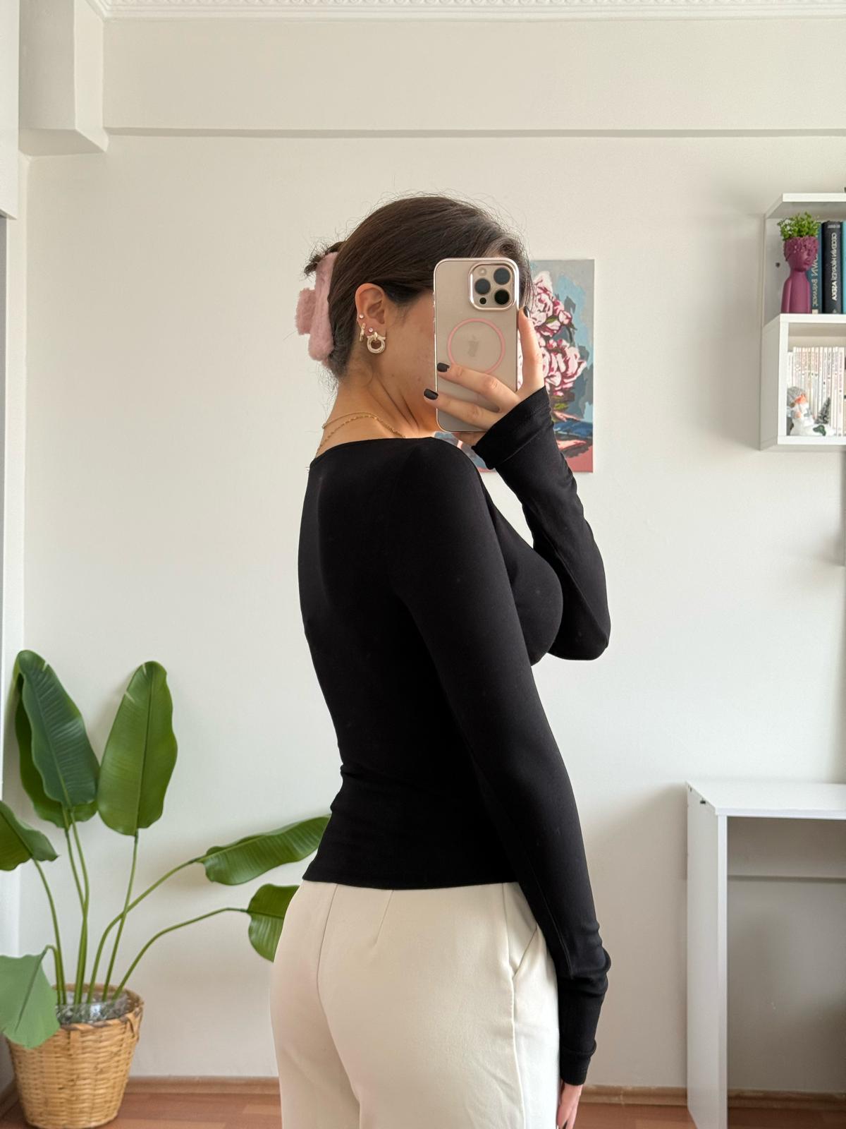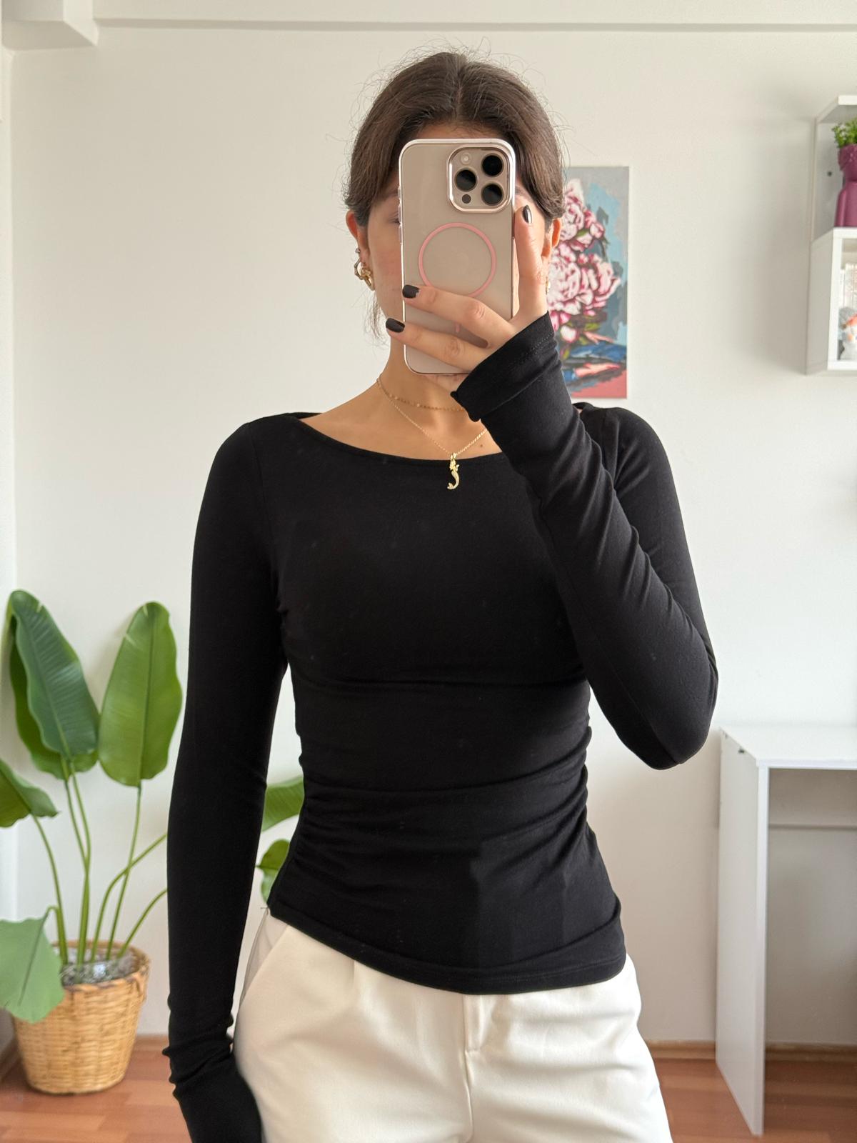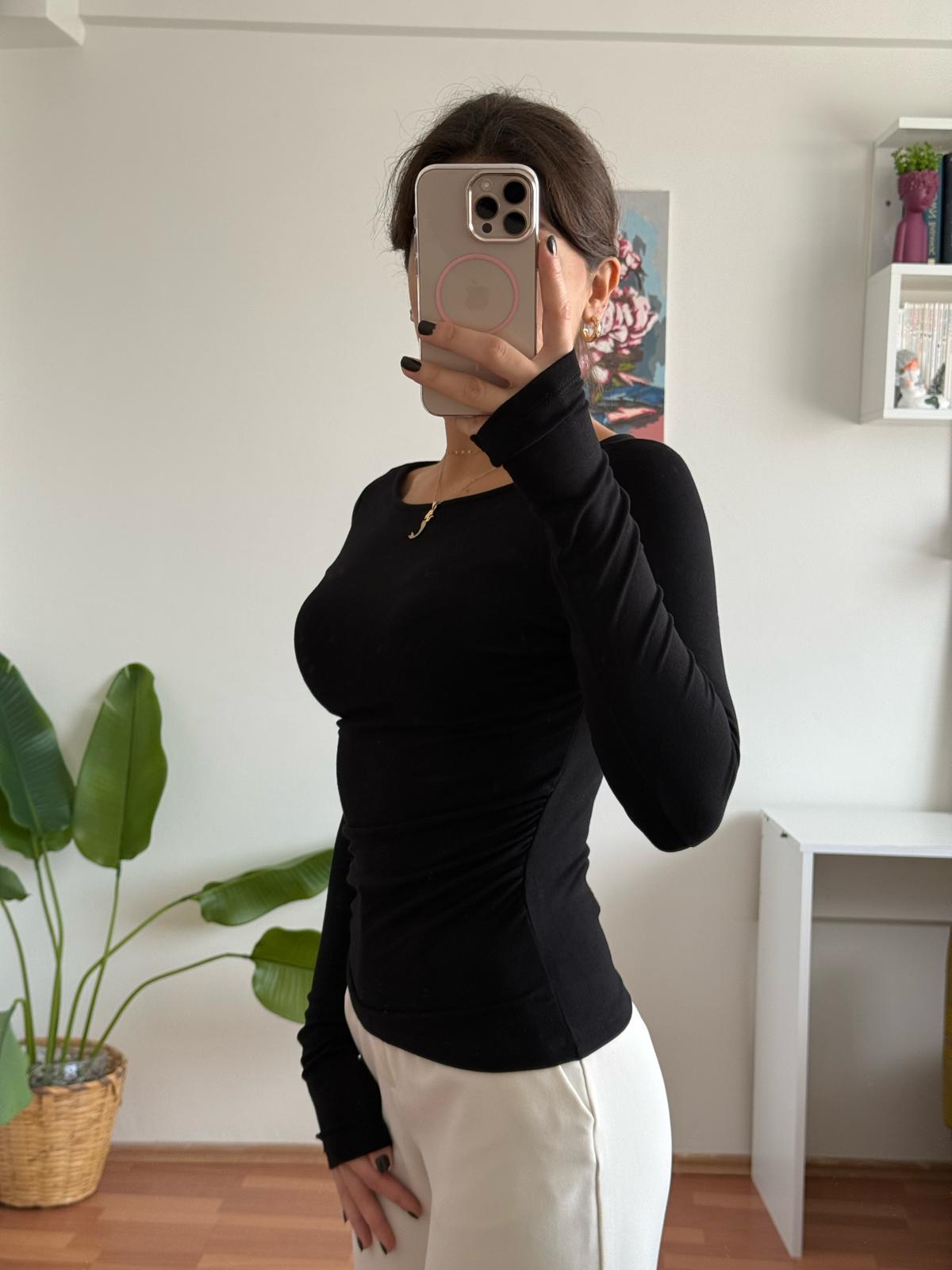 Kayık Yaka Yanı Büzgülü Bluz - Siyah