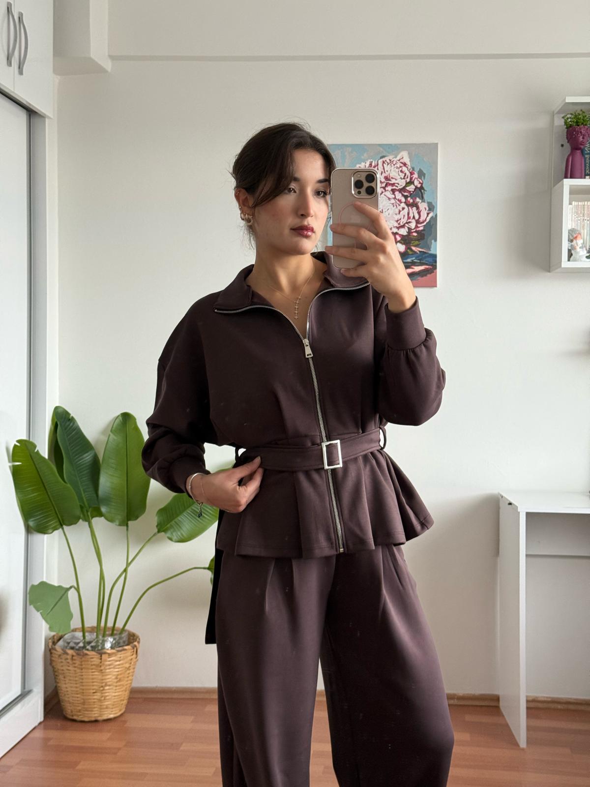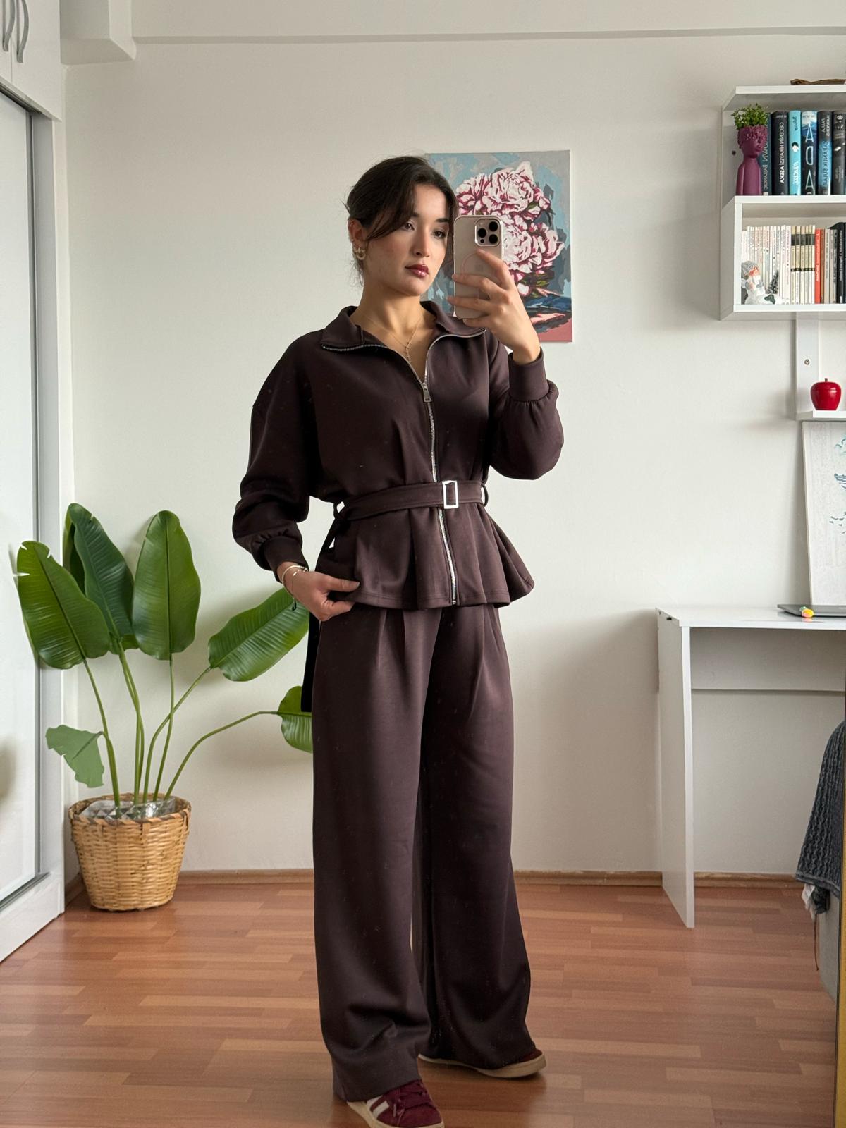 Kemer Detay Pileli Takım - Kahverengi, şıklığı ve konforu bir arada sunan harika bir seçenektir. Hem stil sahibi, hem de rahat hissetmek isteyenler için vazgeçilmez bir parçadır. Siz de tarzınızı bu özel takım ile ön plana çıkarın!
