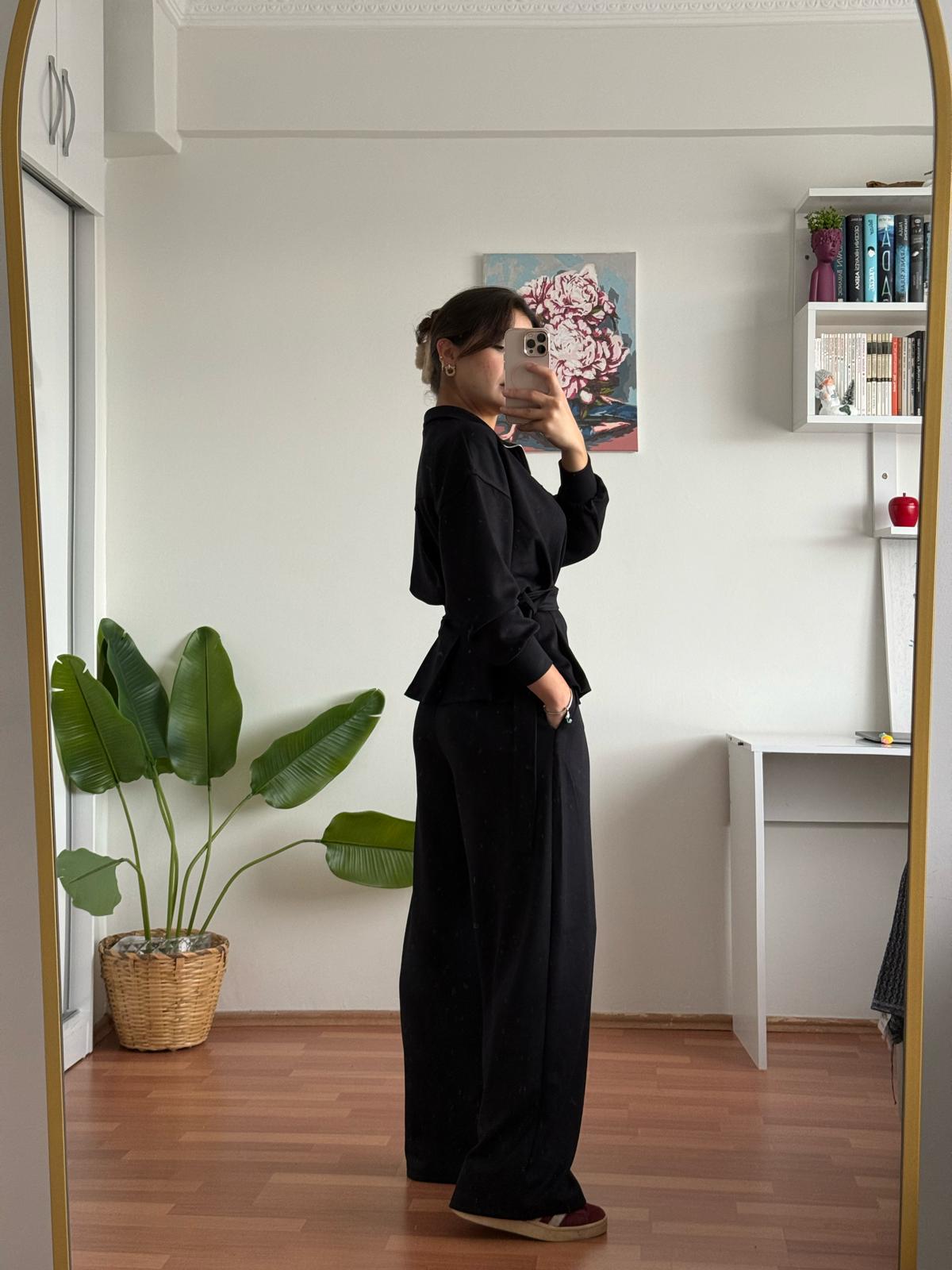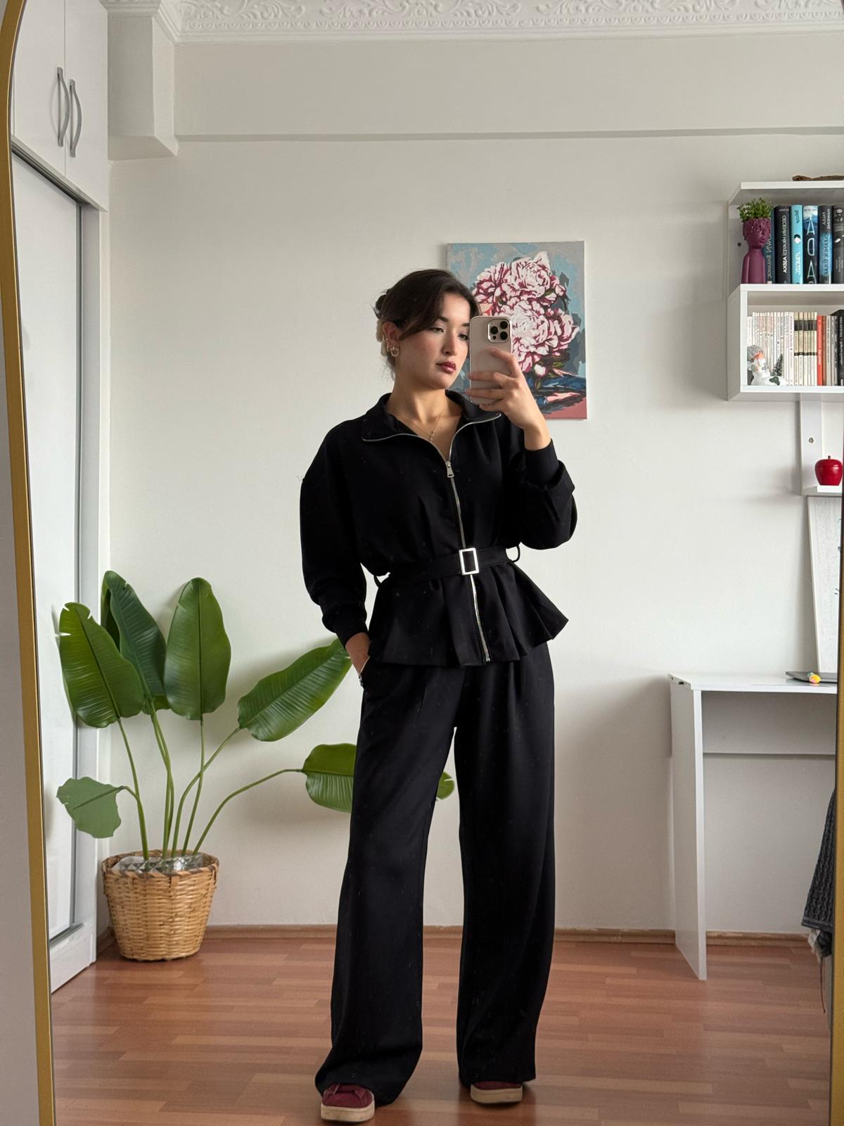 - Kemer Detayı: Bel kısmında yer alan şık kemer, vücut hatlarını ön plana çıkartır ve takımın stilini tamamlar.
