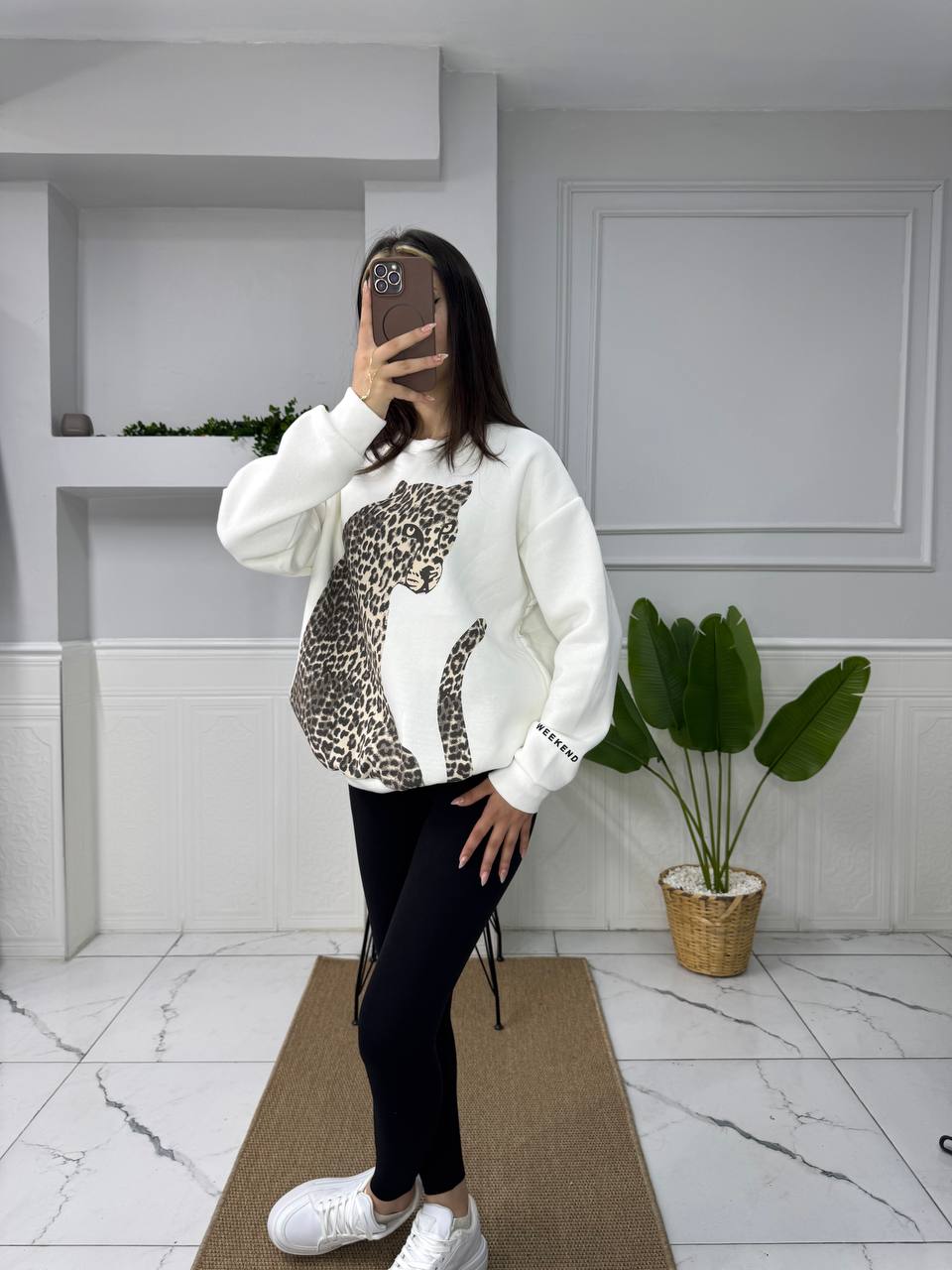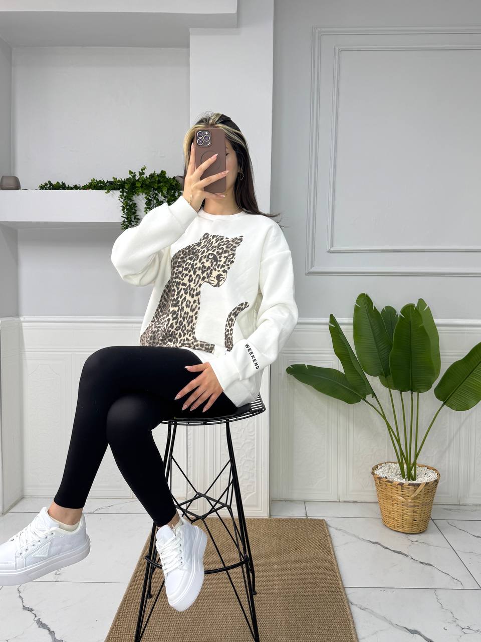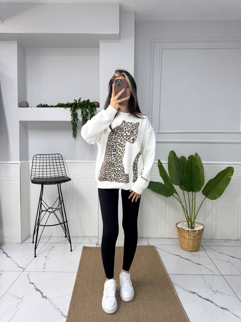 Göz alıcı ve şıklığıyla dikkat çeken leopar baskı üç iplik sweatshirt, rahatlığı ve tarzı bir araya getirerek gardırobunuzun vazgeçilmez parçalarından biri haline geliyor. Günlük kullanımda konfor arayan ve stillerini yansıtmak isteyen herkes için ideal bir seçenek sunmaktadır.