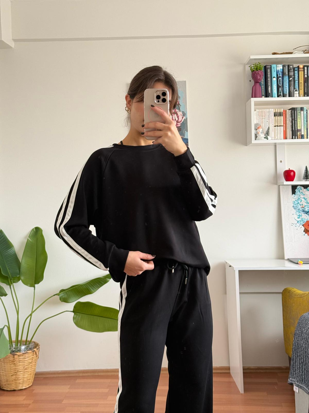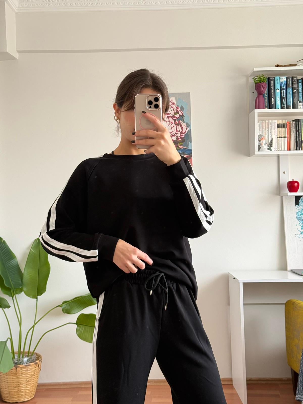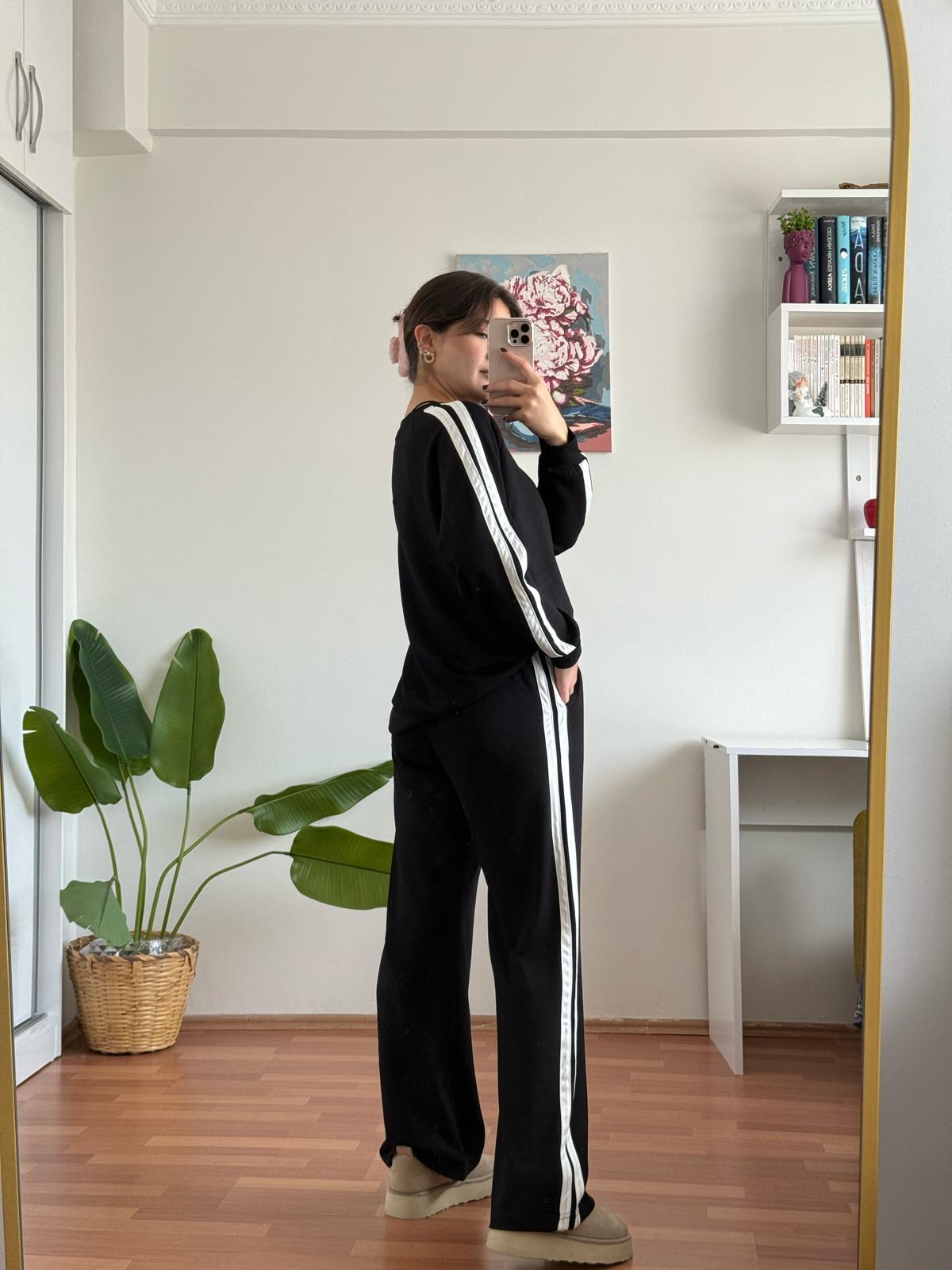 Şerit Detay Oysu Takım - Siyah, tarzınızı yansıtırken konforunuzu da asla göz ardı ettirmeyecek bir üründür. Hem şıklığı hem de kullanışlılığı ile her anınıza eşlik etmeye hazır. Modaya dair son trendleri takip edenler için ideal bir seçim olan bu takım, her yaş grubuna hitap ederek, gardırobunuzda önemli bir yer edinecektir.