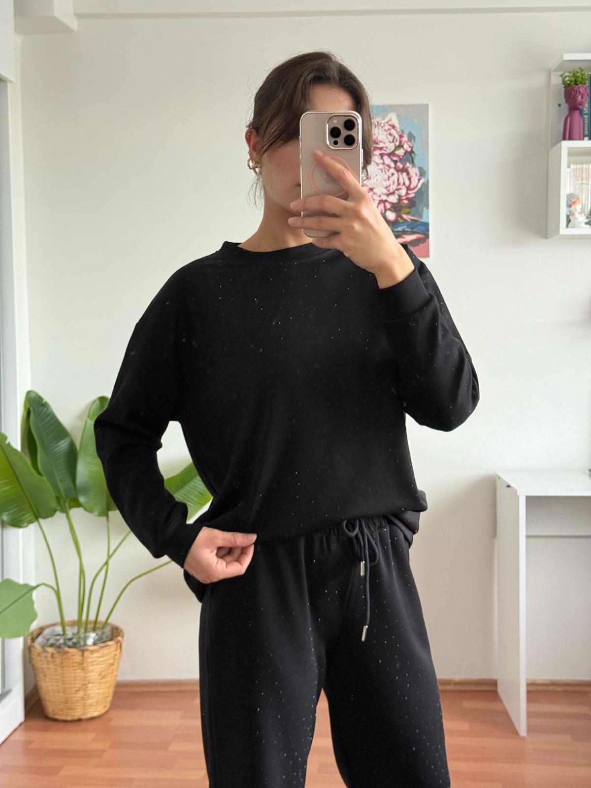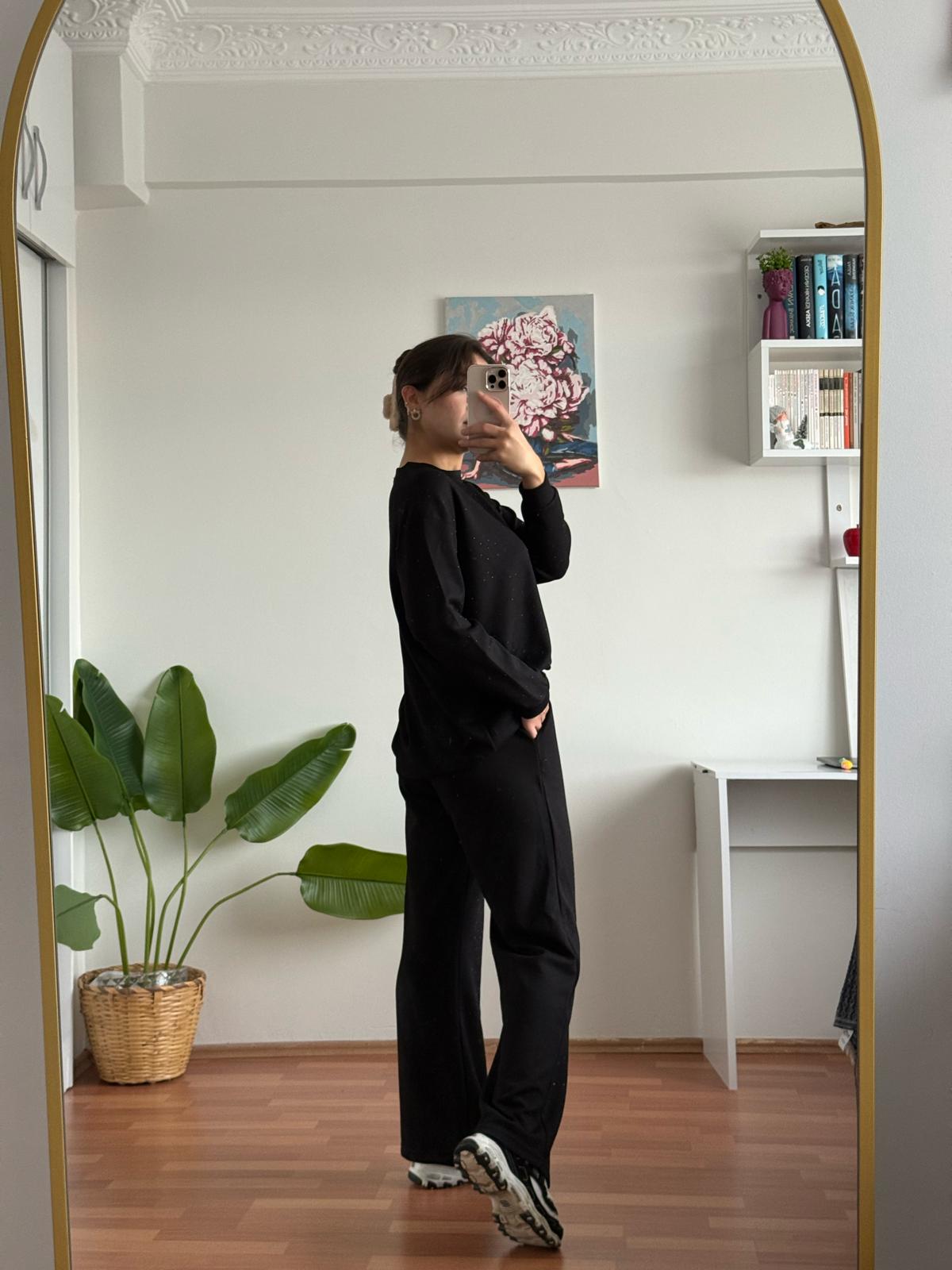 Siyah rengin asaleti, taş detaylarla birleşerek göz alıcı bir görünüm oluşturur. Hem gündüz hem de gece kullanıma uygun olarak tasarlanan bu takım, çeşitli aksesuarlarla kombinlenerek farklı stiller yaratmanıza olanak tanır. İster yüksek topuklu ayakkabılarınızla, ister spor ayakkabılarınızla tercih edin, her iki durumda da şıklığınızı korursunuz.